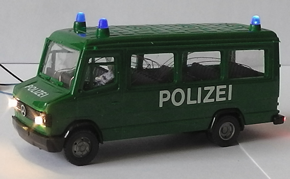 Standmodell Polizeifahrzeug in HO beleuchtet mit Blaulicht (selbsblinkenden blauen LED), Fahr-und Rücklicht.